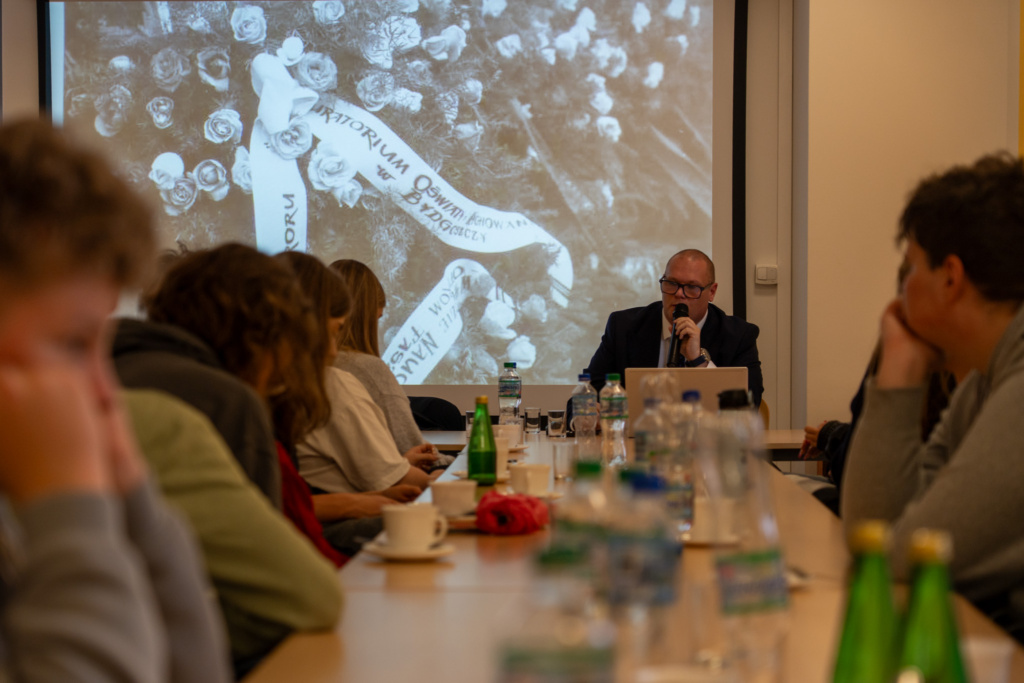 • Krzysztof Drozdowski poprowadził prelekcję zatytułowaną „Niemieckie zbrodnie na Kujawach”, zwracając uwagę na źródła archiwalne, miejsca pamięci oraz wyzwania rzetelnego upamiętniania.
